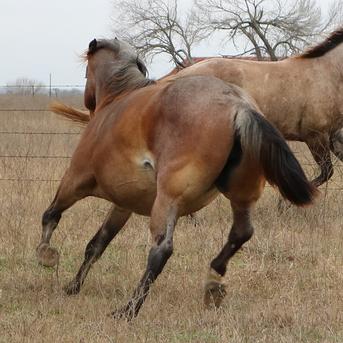 Sunny is out of Swisher's Dividend who is a daughter of Swisher Hancock who is 10.25% Joe Hancock and 21.88% Blue Valentine. He is broke to ride and has sired numerous roping and barrel racing money earners. He is by Dividend Coup sire of 189 foals with 2 AQHA performers and numerous roping, ranch and barrel offspring. Dividend Coup is by Plenty Try, a blue roan stallion and considered to be one of the best sons of Gooseberry. Plenty Try sired 157 registered foals with 3 performers. As with Dividened Coup, many of his offspring competed in non-AQHA roping, barrel racing and other speed events. Other great horses on the dam side include: Blue Valentine